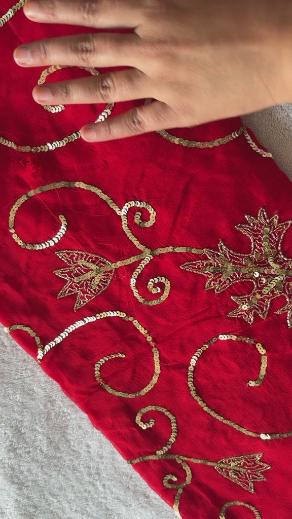 This hand-embroidered red Tari Jaal saree features intricate sequins and Kutdana detailing. The Jaal design covers the entire saree, adding a touch of elegance and sophistication. Each saree comes with an unstitched crape blouse piece, allowing for personalized tailoring. Expertly crafted for a stunning and unique look.