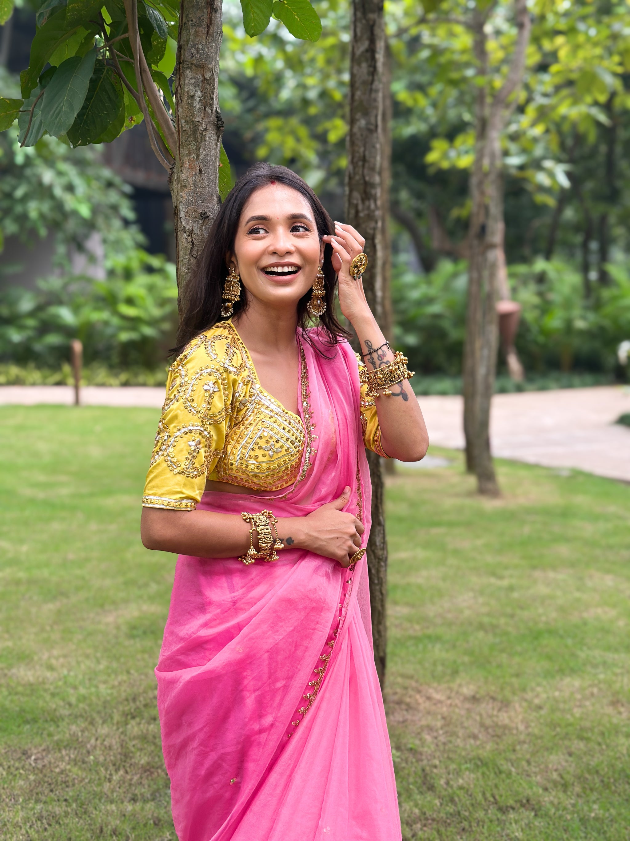 Experience the timeless elegance of our Mohini Pink Organza Saree. Made with Purr Organza fabric and intricately hand-embroidered with Zari ,Sequin and beads work border, this saree exudes sophistication. This saree includes one unstitched plain blouse piece
