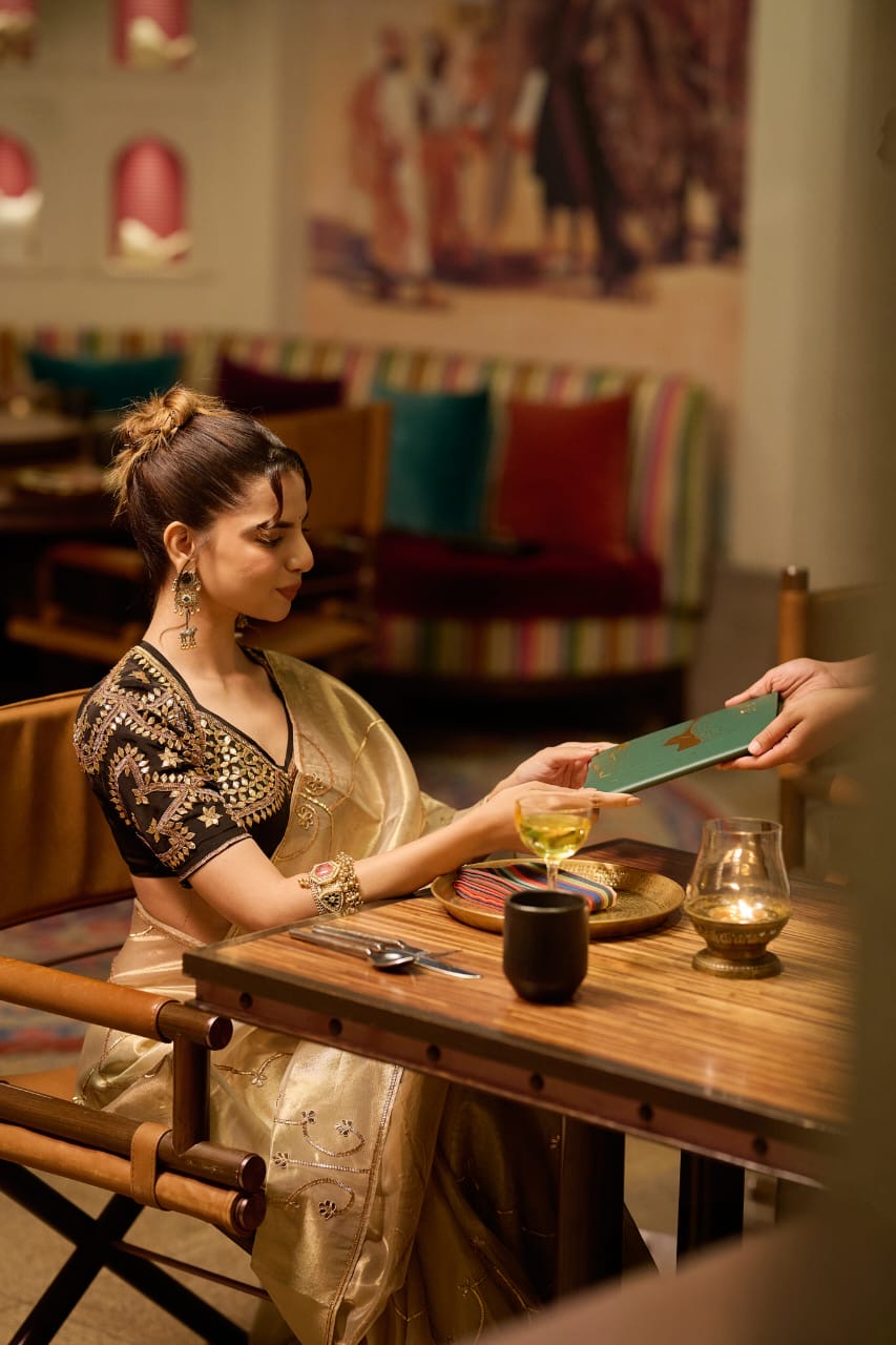 For a complete look, pair it with the Ratri Golden Pure tissue silk saree (sold separately).