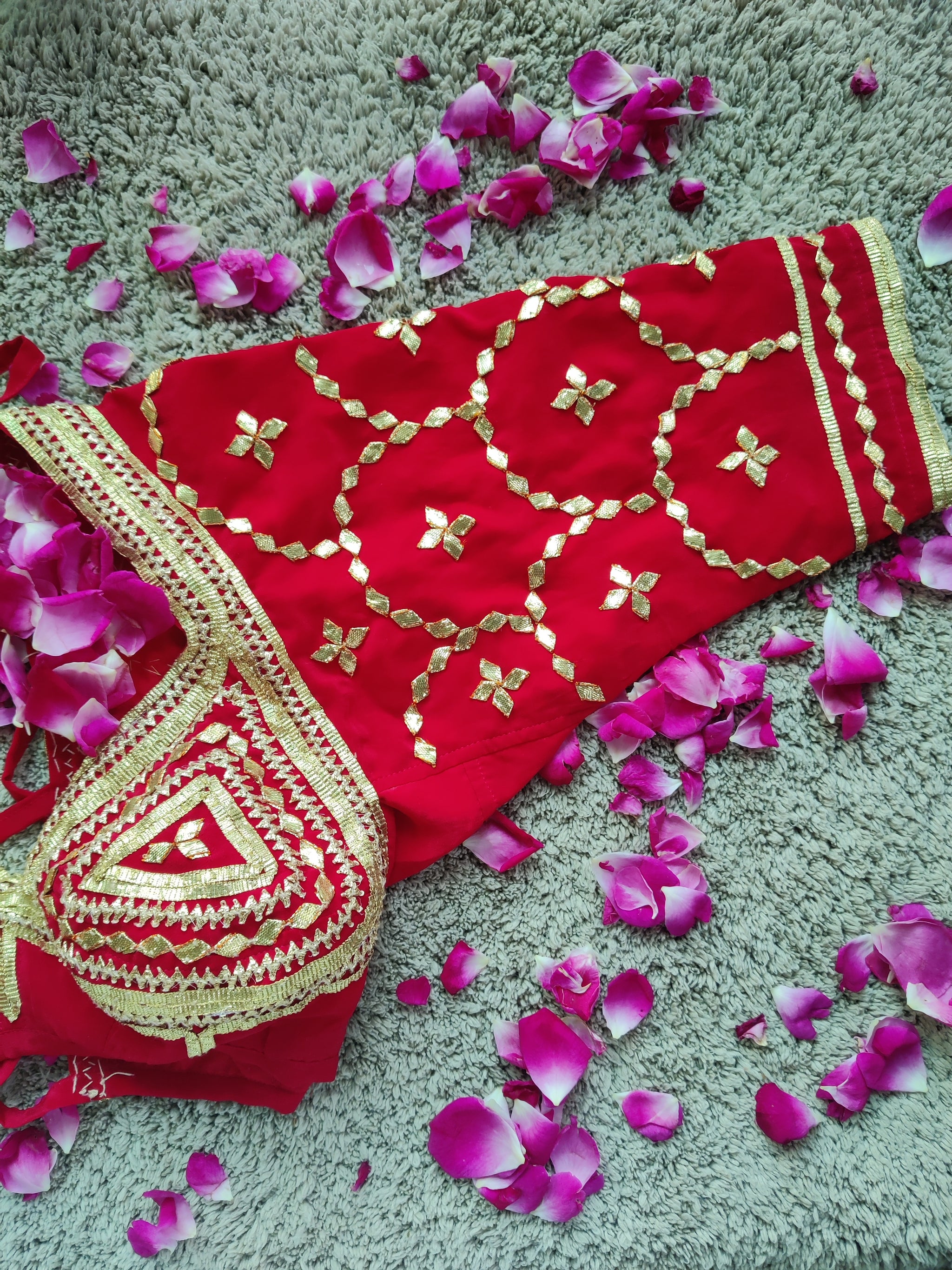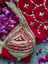 Experience the rich hues of Surkh Laal Pure Crape Angi, boasting a vibrant red color and intricate copper Jaal Gota detailing. The Tuki is adorned with a beautiful dark gold highlight.